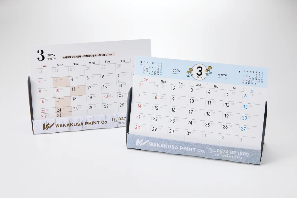| カスタム | 広告入れ、名入れ可 / デザインテンプレート3種 日付のフォント変更、六曜・祝日・月齢・名入れの記載の有無カスタム可能 |